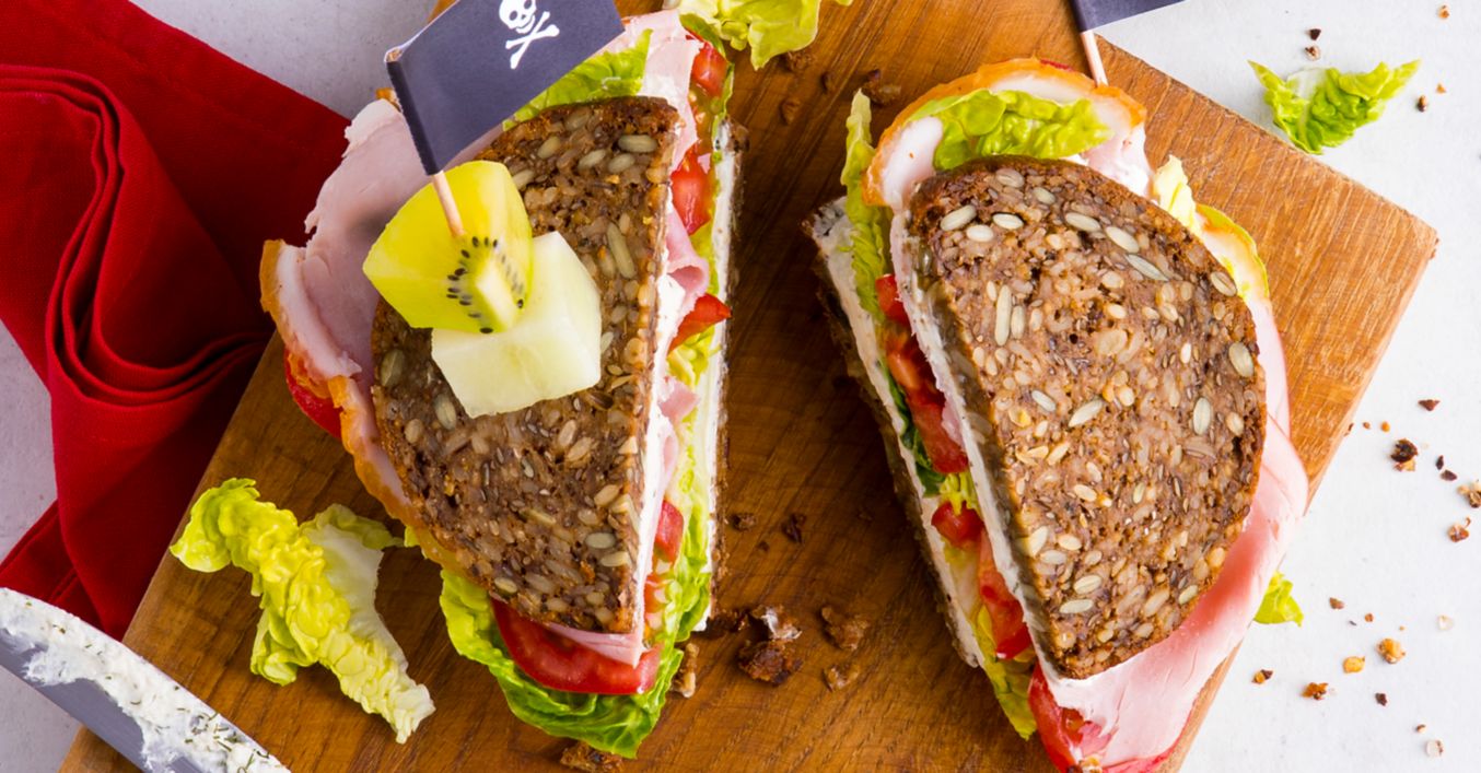 Vollkornbrotscheiben mit Kräuterfrischkäse bestreichen. Salatblätter waschen und trocken schütteln. Tomate waschen und in Scheiben schneiden. Salatblätter, Tomatenscheiben und Schinken auf das Brot legen und zusammenklappen. Piratenstulle halbieren.