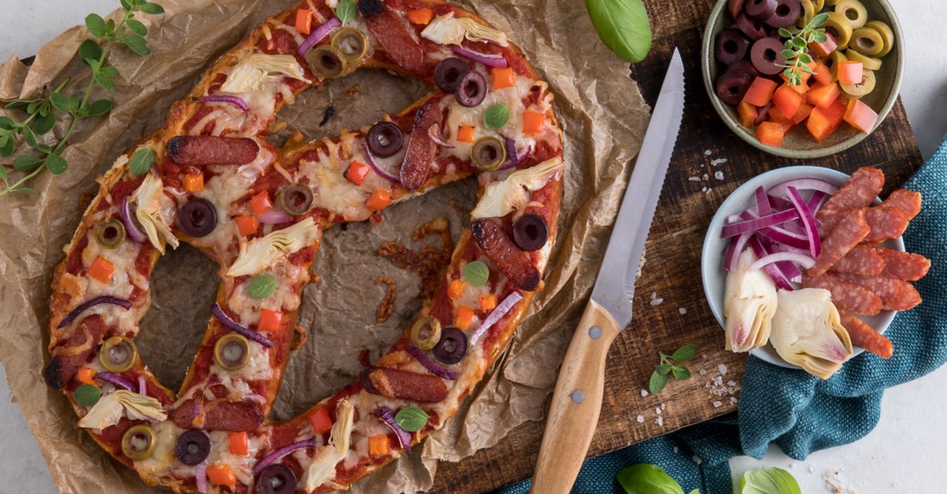 Nach Belieben mit Paprika, Zwiebeln, Salami, Artischocken und Oliven belegen und im vorgeheizten Ofen im mittleren Bereich circa 15 Minuten goldbraun backen.