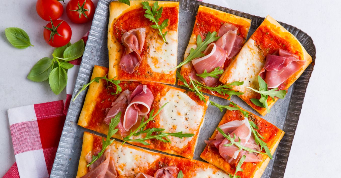 Schinken grob zerkleinern. Nach der Hälfte der Backzeit Schinken über die Pizza geben.