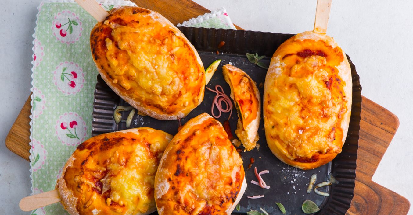 Pizzateig auf einer mit Mehl bestäubten Arbeitsfläche ausrollen und in 8 gleichmäßig große, ovale Böden ausstechen.