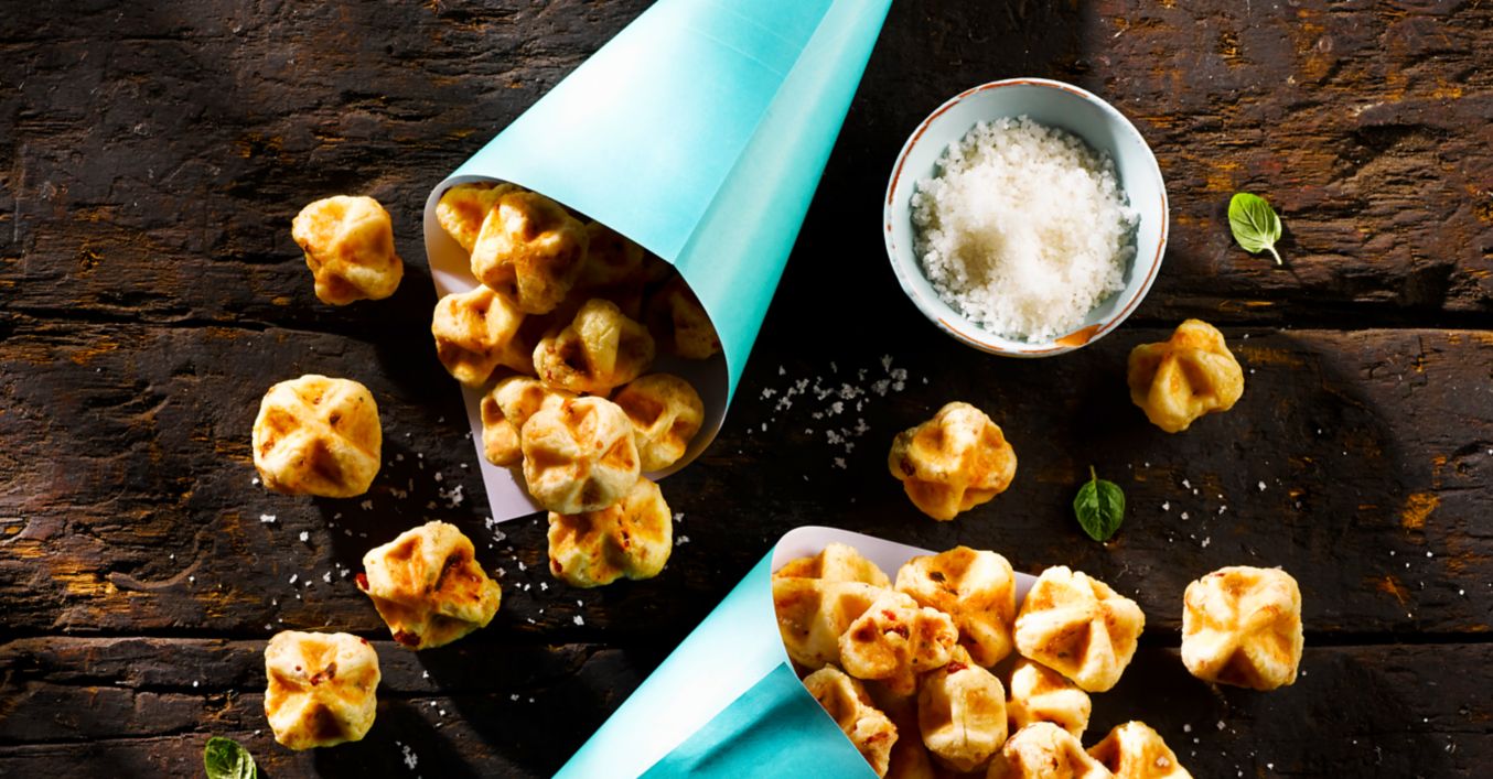 Die Waffelbites 4 bis 5 Minuten goldbraun backen und in kleinen Papiertütchen verpacken.
