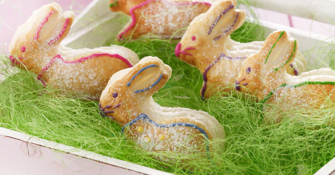 Den Teig mit Backpapier auf einem Backblech entrollen und mit österlichen Ausstechern (wie Hasen) ausstechen.