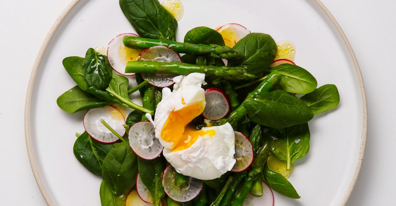 Pochiertes Ei auf grünem Spargel-Spinat-Salat