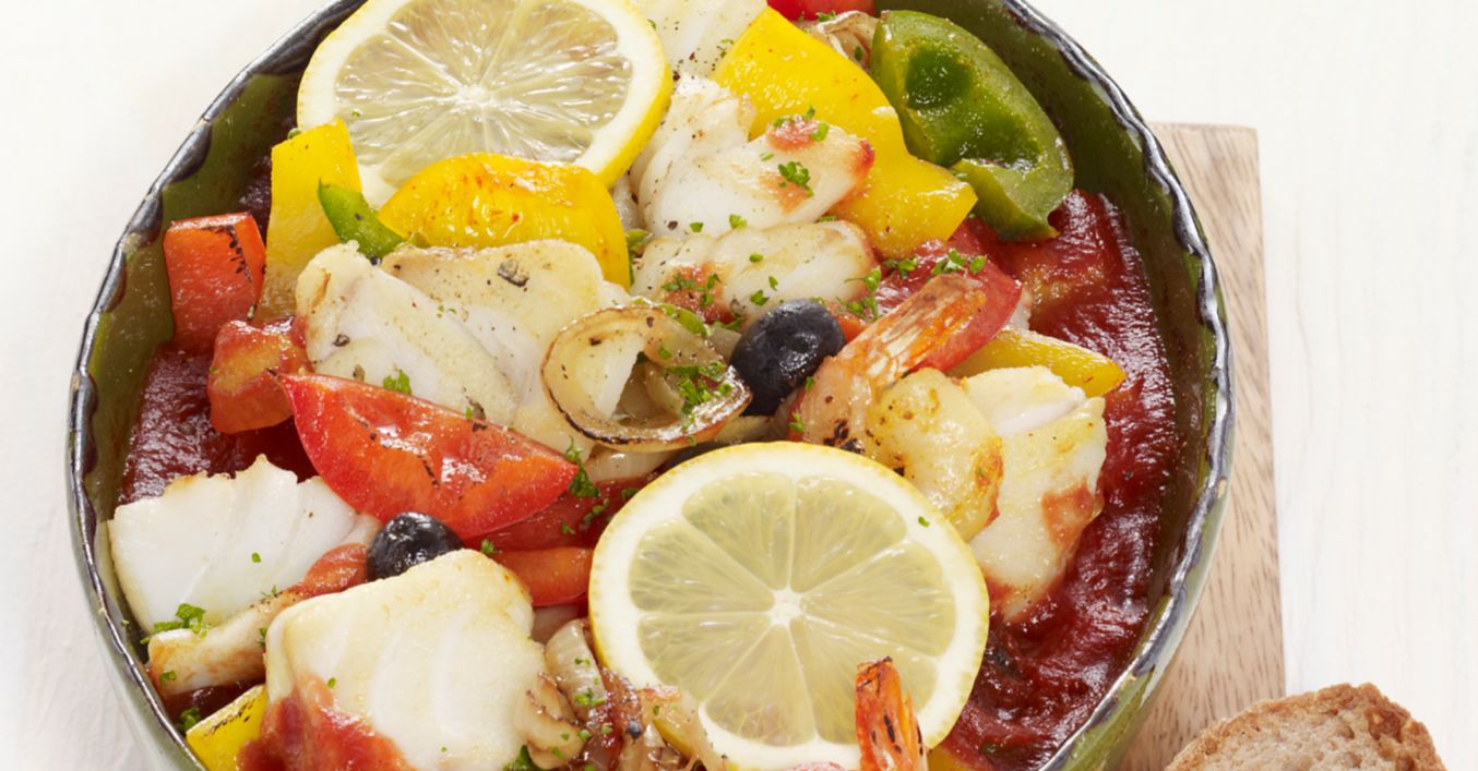 Kabeljau waschen, trocken tupfen, in Stücke schneiden, säuern und salzen. Zwiebeln und Knoblauch abziehen, Zwiebeln in Ringe schneiden und Knoblauch zerdrücken. Garnelen waschen, trocken tupfen, in erhitztem Öl in einem backofengeeigneten Bräter anbraten und herausnehmen.