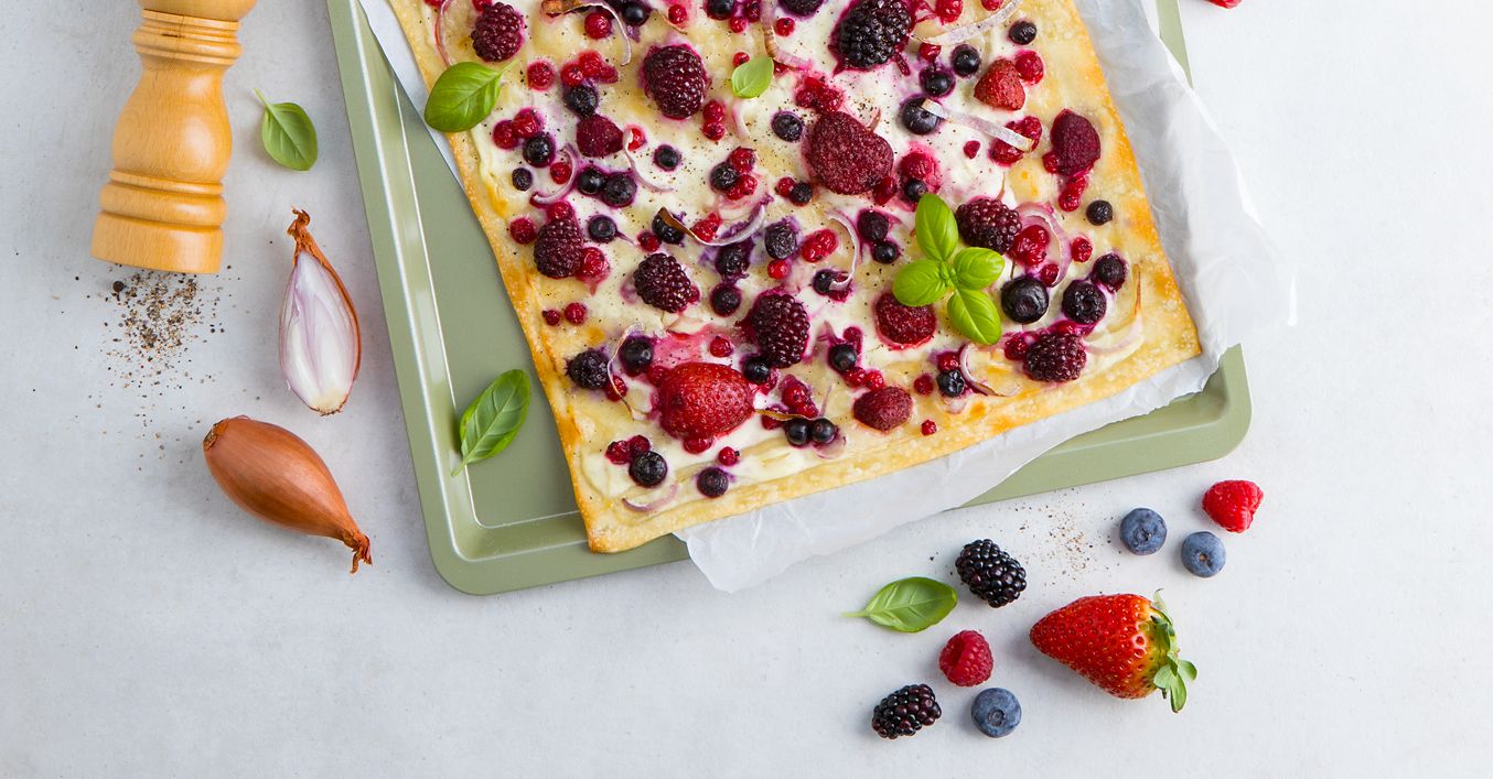 Teig auf ein mit Backpapier ausgelegtes Backblech legen und mit Schmand bestreichen. Dann gleichmäßig mit Beeren und Schalottenstreifen belegen und für 10 bis 15 Minuten im Backofen backen.