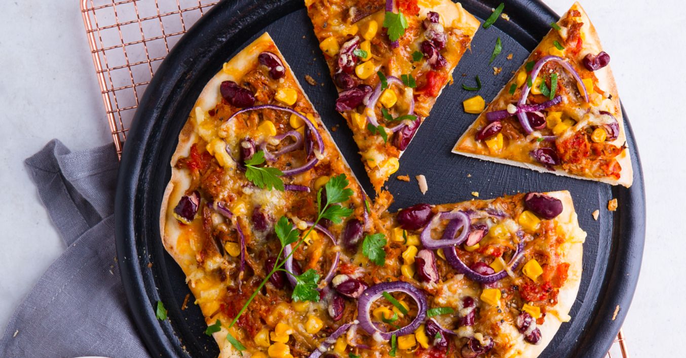Teig auf einer bemehlten Arbeitsfläche noch einmal durchkneten und in 4 Portionen aufteilen. Mit Hartweizengrieß auf Backpapier zu runden Pizzaböden (Durchmesser circa 24 Zentimeter) ausrollen, gleichmäßig mit der Pulled-Pork-Mischung bestreichen und mit Mais, Kidneybohnen und Zwiebelringen belegen.