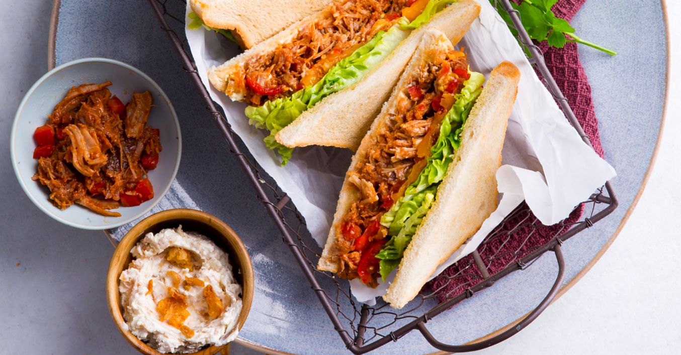 4 Sandwichscheiben mit Schmand bestreichen, mit Pulled Pork sowie Tomatenscheiben belegen, mit Cheddar bestreuen und im Ofen 3 bis 5 Minuten backen, bis der Käse geschmolzen ist.