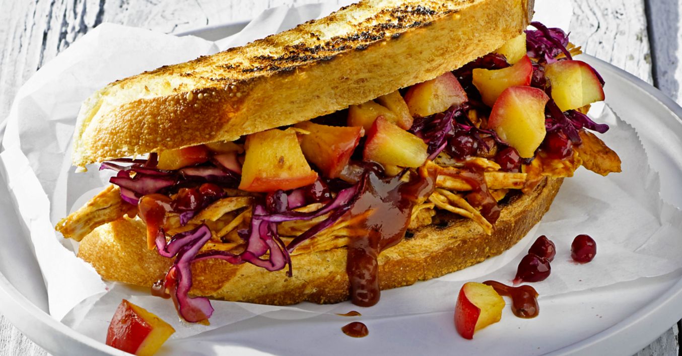 Die Putenbrust vom Grill nehmen und in Alufolie einschlagen. 15 Minuten ruhen lassen. Dann das Putenfleisch in kleine Stücke zupfen. Die übrige Barbecue-Soße etwas erwärmen und das Putenfleisch damit marinieren. Parallel das Brot auf dem Grill etwas anrösten. Das Fleisch auf den Brotscheiben anrichten und die Bratapfelwürfel und das Rotkraut darüber verteilen.