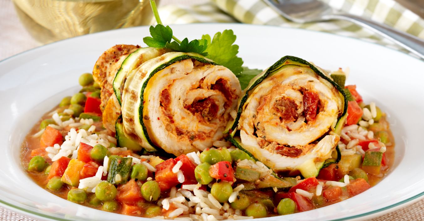 Zucchino waschen, putzen und der Länge nach in 4 dünne Scheiben schneiden. Putenschnitzel eng aufrollen, mit je 1 Zucchinoscheibe umwickeln, mit Holzspießen fixieren und in 2 Esslöffel erhitztem Öl anbraten. 200 Milliliter Brühe angießen und abgedeckt circa 30 Minuten schmoren. Reis in Salzwasser 25 bis 30 Minuten garen.