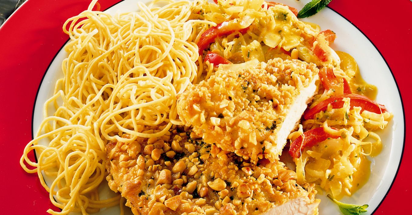 Putenschnitzel mit Pfeffer, Currypulver und Petersilie würzen und nacheinander in Mehl, verquirlten Eiern und Erdnüssen wenden. Öl erhitzen und die panierten Putenschnitzel bei mittlerer Hitze ca. 10-15 Minuten braten, herausnehmen und warm stellen.