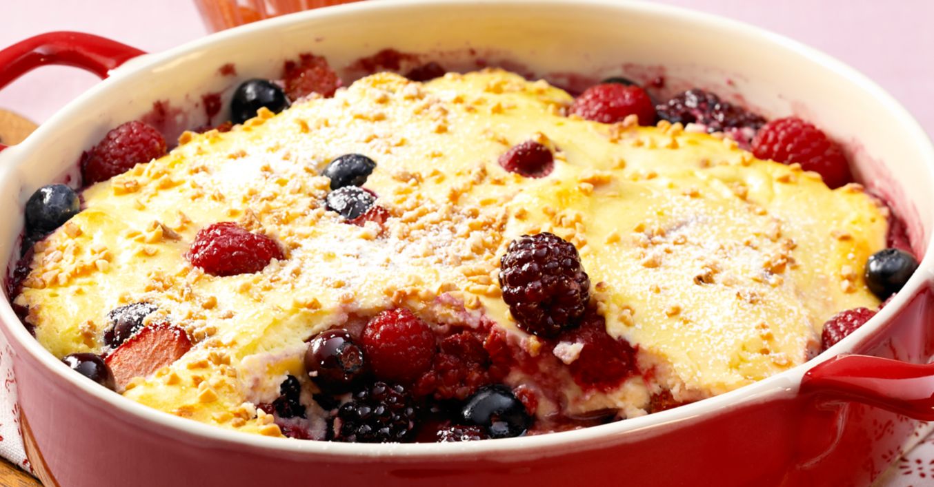 Mit der restlichen Butter eine Gratinform einstreichen. Gemischte Beeren in der Form verteilen und die Quarkmasse darauf streichen. Mandeln überstreuen und im vorgeheizten Backofen bei 180 Grad Celsius (Gas: Stufe 3, Umluft 160 Grad Celsius) circa 30 bis 40 Minuten goldbraun backen.