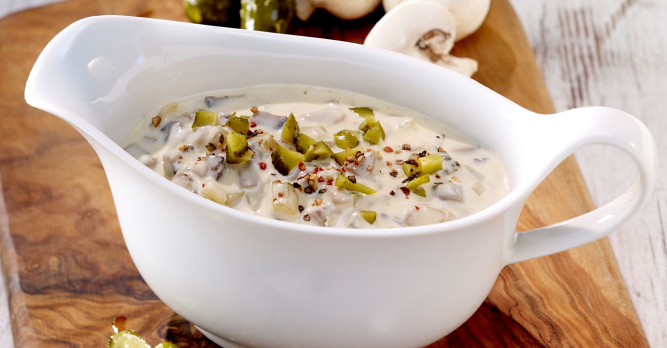Zwiebel abziehen und fein würfeln. Champignons putzen und mit Gewürzgurken in feine Würfel schneiden. Öl im Bratensatz erhitzen, Zwiebel- und Champignonwürfel anschwitzen, Gurkenwürfel zugeben und kurz anbraten. Mit Sahne, Gurkensud und 2 Esslöffeln Wasser ablöschen.