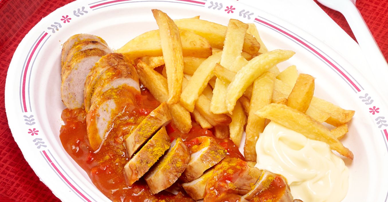 Currywurst und Pommes auf Teller anrichten und nach Wunsch mit Mayonnaise servieren.