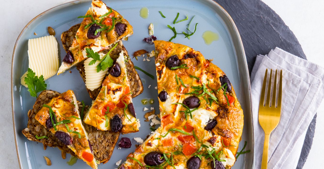 Tomatenstücke, Oliven und den zerbröselten Fetakäse auf dem Omelette verteilen. Einen Deckel auf die Panne geben und das Omelette 5 bis 6 Minuten durchgaren.