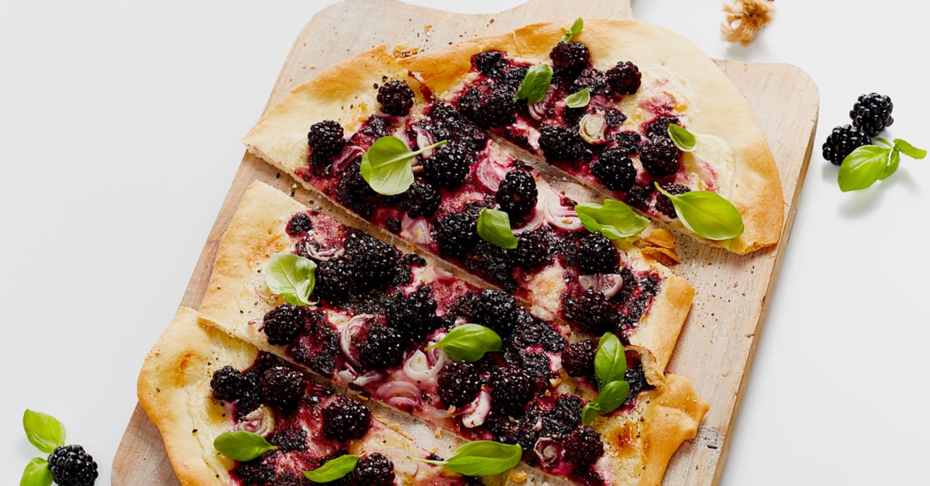 Teig in 4 Teile teilen und auf einer mehlierten Arbeitsfläche je 2 Millimeter dünn ausrollen. Je einen Teigfladen auf ein mit Backpapier ausgelegtes Backblech legen. Mit Crème fraîche bestreichen, mit Brombeeren und Schalotten belegen.