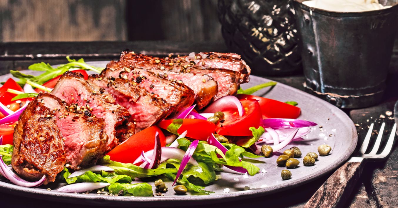 Tagliata vom Rumpsteak mit Aioli und Tomaten-Rucola-Salat