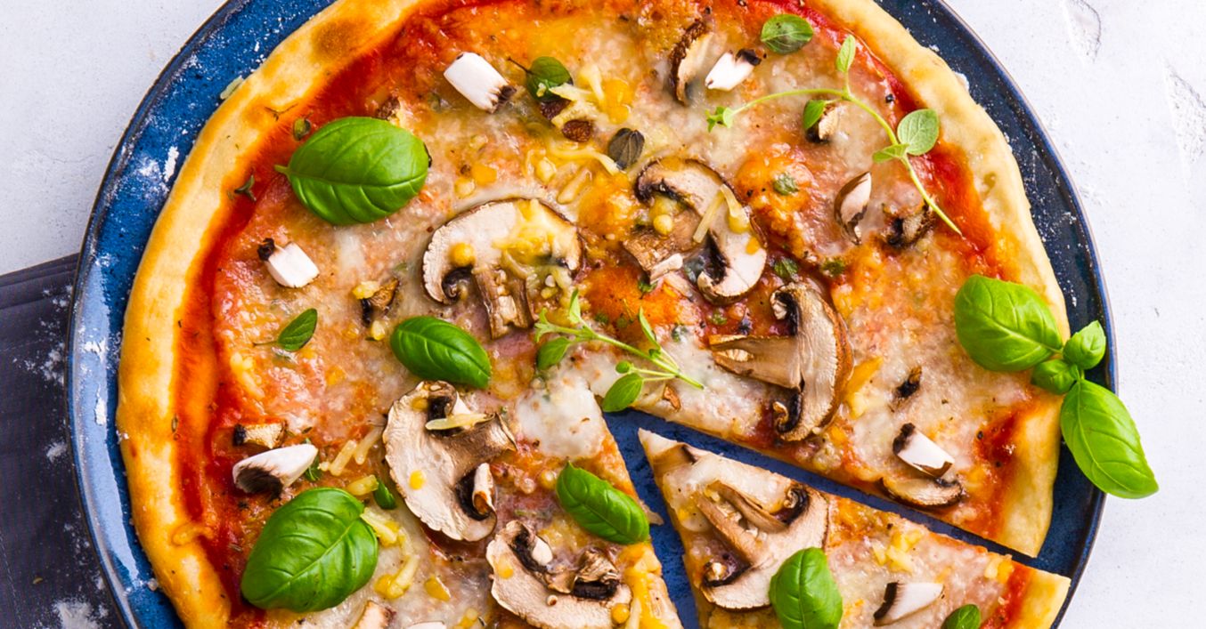 Für den Belag: Tomaten und Mozzarella in Scheiben schneiden. Champignons in Scheiben schneiden. Pizza mit Tomaten-, Mozzarella- und Champignonscheiben belegen. Im vorgeheizten Backofen bei 200 °C (Umluft: 180 °C ) 30 bis 35 Minuten knusprig backen. Basilikum grob zupfen und auf die Pizza streuen. Pizza Funghi in Stücke schneiden und servieren.