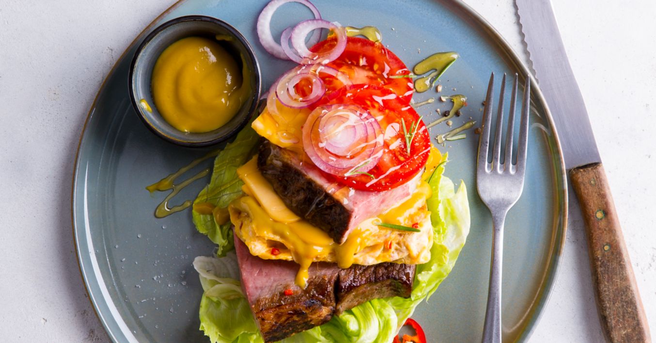 Zuletzt anrichten und dabei von unten anfangen: Cheddarkäse-Scheibe, Zwiebelringe, Tomatenscheibe, Roastbeef-Scheibe, Honig-Senf-Soße, Toastbrotscheibe, Cheddarkäse-Scheibe, Rostbeef-Scheibe, 1 Blatt Eisbergsalat