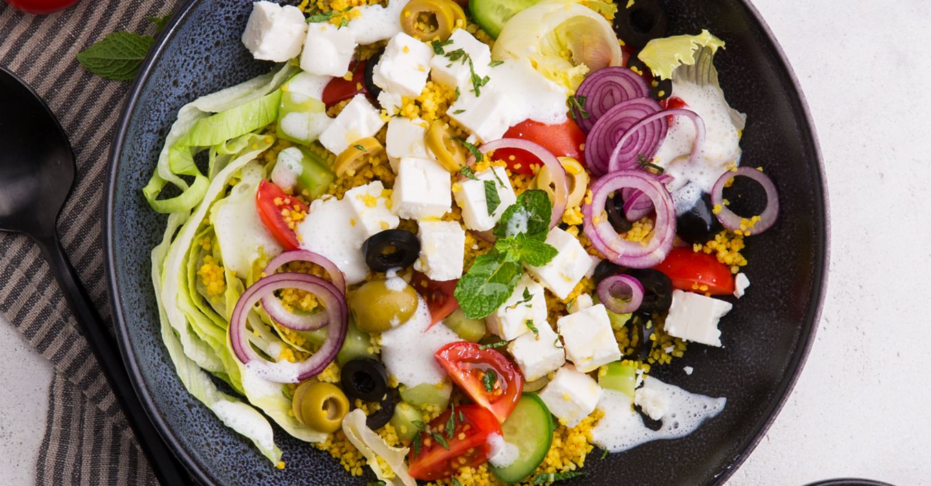 Couscous mit Kirschtomaten, Salatstreifen, Gurke und Oliven mischen. Mit Zwiebeln, Fetakäse, Joghurtdressing und Olivenöl verfeinern und in Schüsseln servieren.