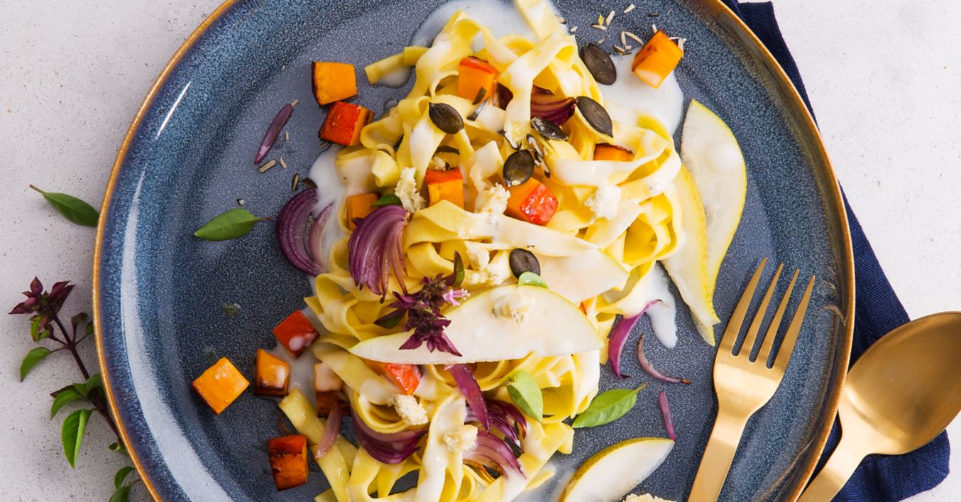 Tagliatelle aus dem Kühlregal nach Packungsanweisung in ausreichend Salzwasser bissfest garen. Sahne, Potted Blue Stilton mit den Birnenspalten in die Pfanne geben und verrühren.
