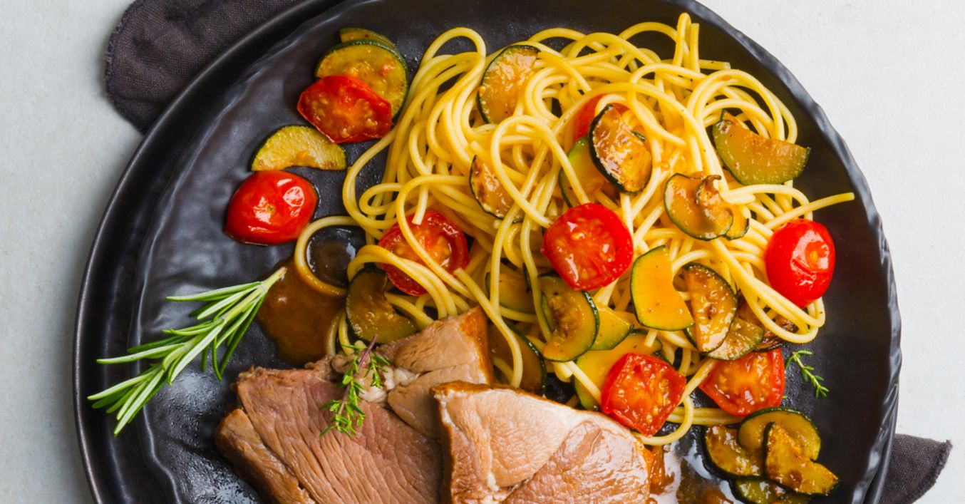 In der Zwischenzeit Cherryrispentomaten waschen und halbieren. Zucchini waschen, längs halbieren und in Scheiben schneiden. Restliches Olivenöl in einer Pfanne erhitzen und die Zucchinischeiben circa 5 Minuten braten. Tomatenhälften dazugeben, mit Salz, Pfeffer und Muskat würzen und circa 8 Minuten bei mehrmaligem Rühren garen. Spaghetti abschütten und unter das Gemüse heben.