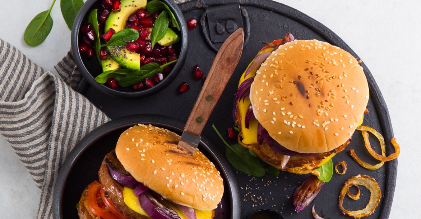 Veganer Onion-Burger mit Avocado-Granatapfel-Salat