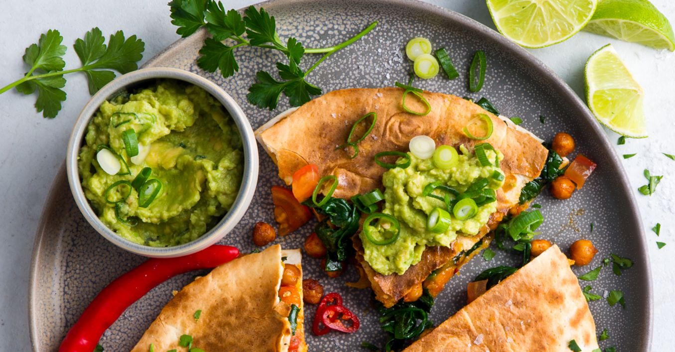 Spinat, Kichererbsen, Tomaten und Käse vermengen. 1 Tortilla in einer beschichteten Pfanne (Durchmesser circa 22 Zentimeter) erwärmen, ein Viertel der Gemüsemischung darauf verteilen, mit einer zweiten Tortilla bedecken, 3 bis 5 Minuten in der Pfanne backen, bis der Käse geschmolzen ist. Danach wenden und 1 bis 2 Minuten weiterbacken. Quesadilla herausnehmen und im Ofen warmhalten.