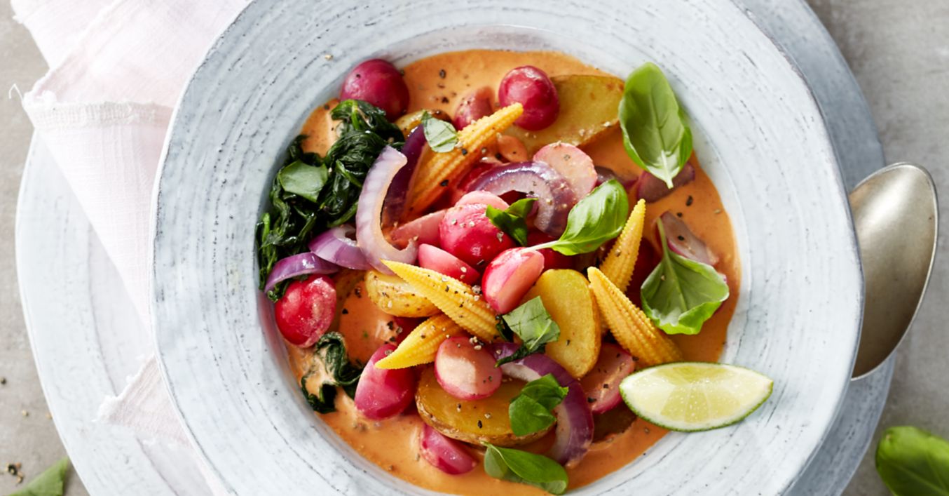 Radieschen putzen, waschen und halbieren. Blattspinat waschen und trockentupfen. Zwiebeln abziehen, in Spalten schneiden und in einer Pfanne im erhitztem Öl circa 3 Minuten anbraten. Radieschenhälften und Kartoffeln hinzugeben und circa 3 Minuten unter ständigem Rühren mitbraten. Mit Currypaste und Brühe ablöschen und weitere circa 5 Minuten auf kleiner Hitze kochen lassen.