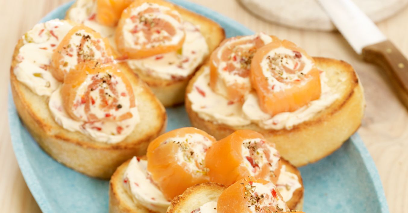 3/4 des Paprikaquarks auf dem Lachs verteilen und zu 16 kleinen Röllchen aufrollen. Ciabatta mit restlichem Quark bestreichen, Räucherlachs-Röllchen auf den gerösteten Ciabattascheiben anrichten und servieren.