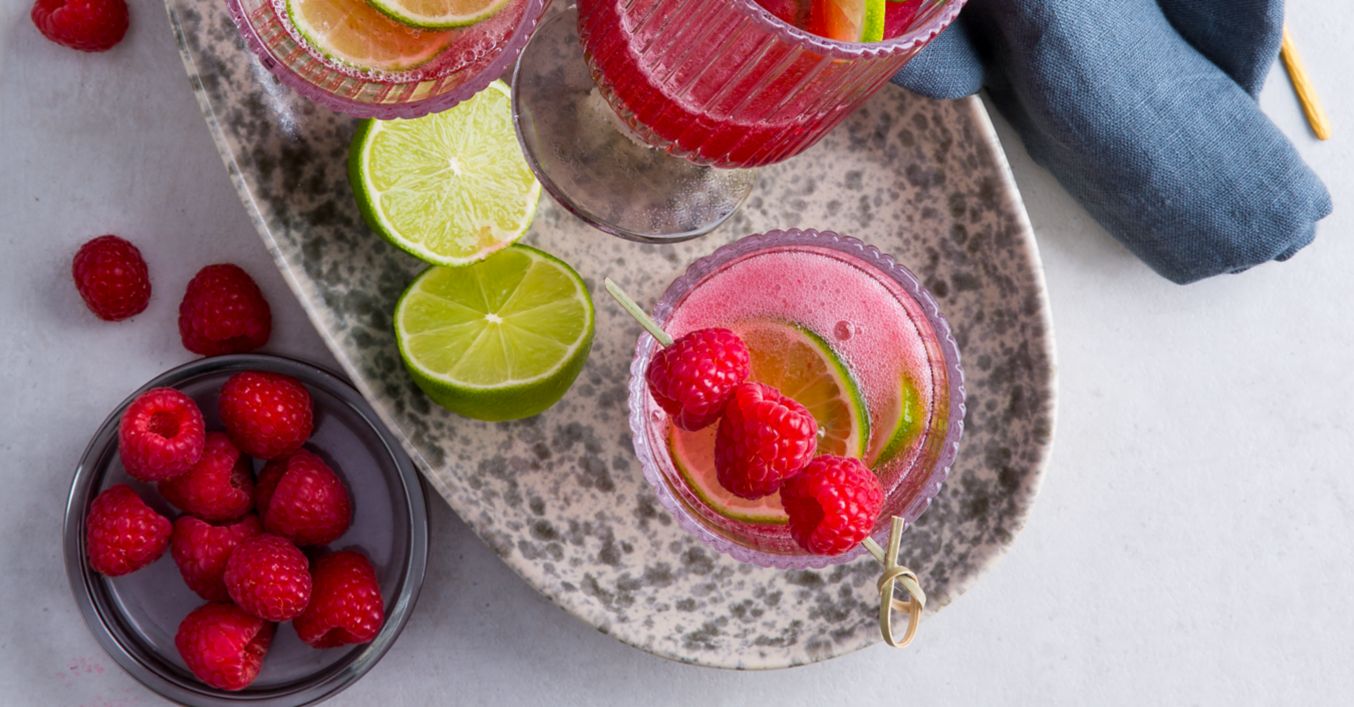 Himbeeren auf einen Spieß reihen und Raspberry Royal damit garniert servieren.