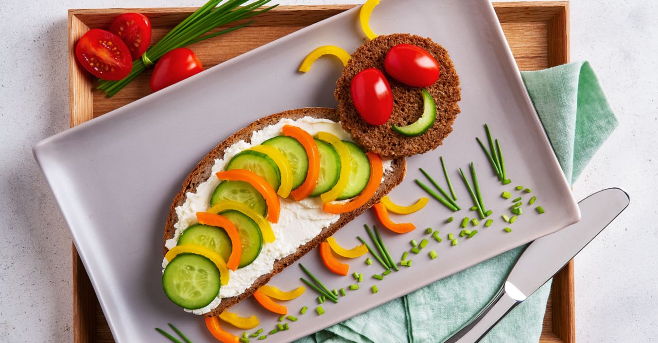 Aus dem Vollkornbrot mit einem Ausstecher einen Kreis ausstechen und als Kopf drapieren. Tomate halbieren und zusammen mit dem Gurken-Halbmond mit etwas Frischkäse als Gesicht auf das runde Vollkornbrot „kleben“.