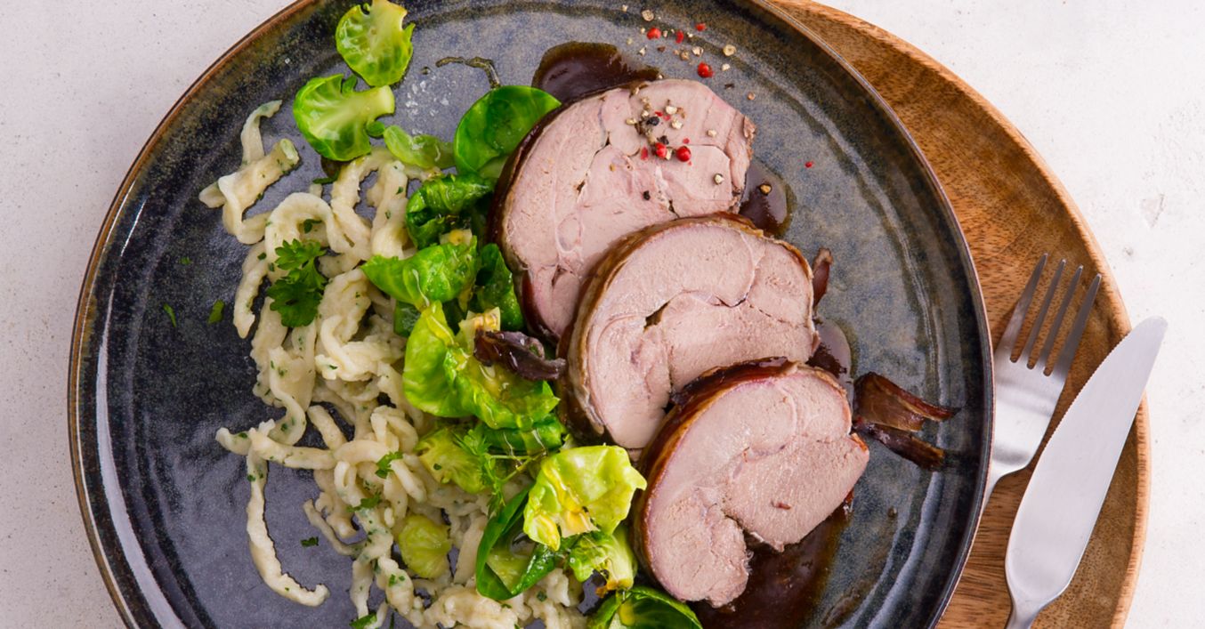 Rehkeule mit Petersilien-Spätzle und Honig-Rosenkohl