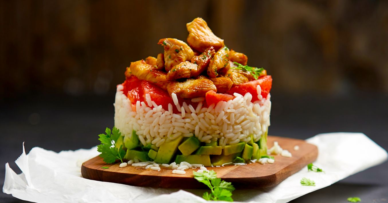 Mithilfe eines Dessertrings oder einer kleinen Form einen Kreis Avocadowürfel anrichten, darauf den Reis, danach die Grapefruitfilets und als Topping die Hähnchenbrust. Die einzelnen Schichten gut andrücken, damit diese beim Servieren nicht auseinanderfallen. Salat mit Dressing beträufeln, nach Wunsch mit Kräutern garnieren und servieren.