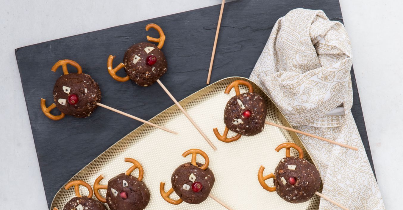 Für die Deko die Brezeln zerteilen und als Geweih in die Kugeln stecken. Für die Augen können Mandeln oder Cashewstücke, für die Nase Granatapfelkerne verwendet werden.