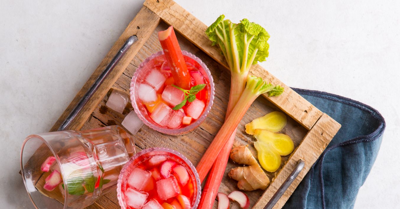 Rhabarber waschen, putzen und in Stücke schneiden. Ingwer schälen und in Scheiben schneiden. Rhabarber, Ingwer, Zucker und Minze mit 500 Milliliter Wasser aufkochen. Teebeutel dazugeben und circa 5 Minuten ziehen lassen.