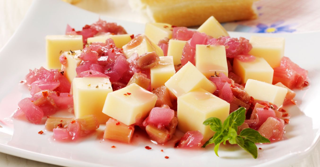 Salsa mit Granatapfelsirup verfeinern und mit Salz, Pfeffer und Chilipulver abschmecken. Käse in Würfel schneiden, mit der noch warmen oder kalten Salsa auf Teller anrichten und mit Baguette servieren.