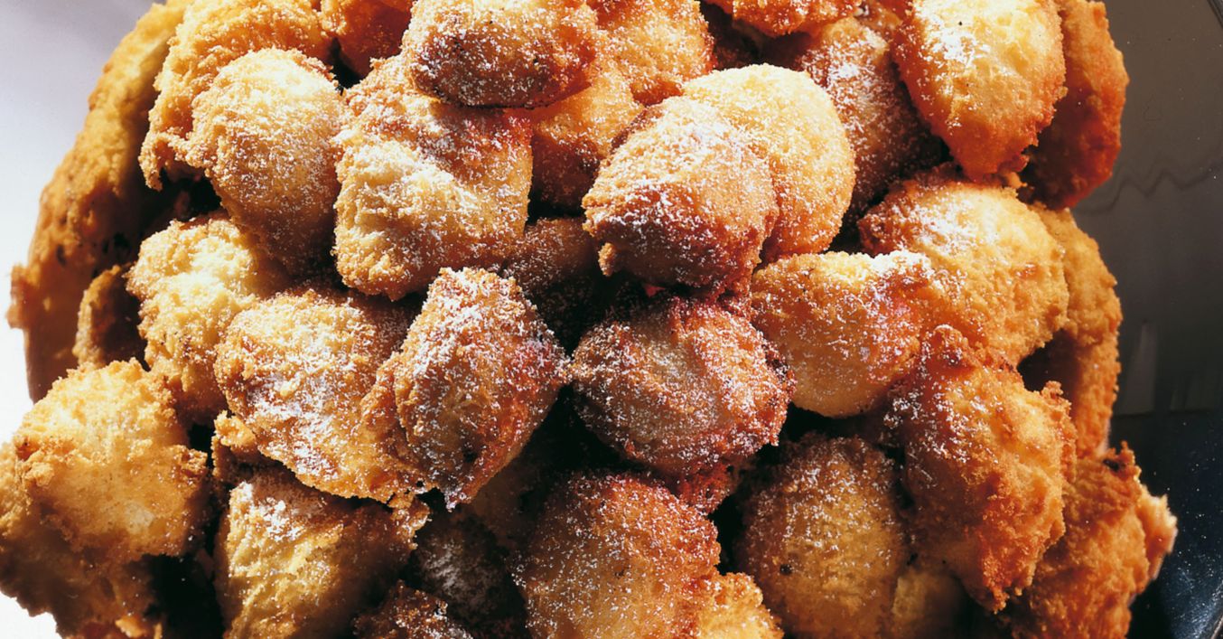 Fett in einer Fritteuse auf 175 Grad erhitzen. Den Teig mit zwei befeuchteten Teelöffeln zu kleinen Mutzen formen, im Fett goldbraun frittieren, abtropfen lassen und nach Wunsch mit Puderzucker bestäubt servieren.