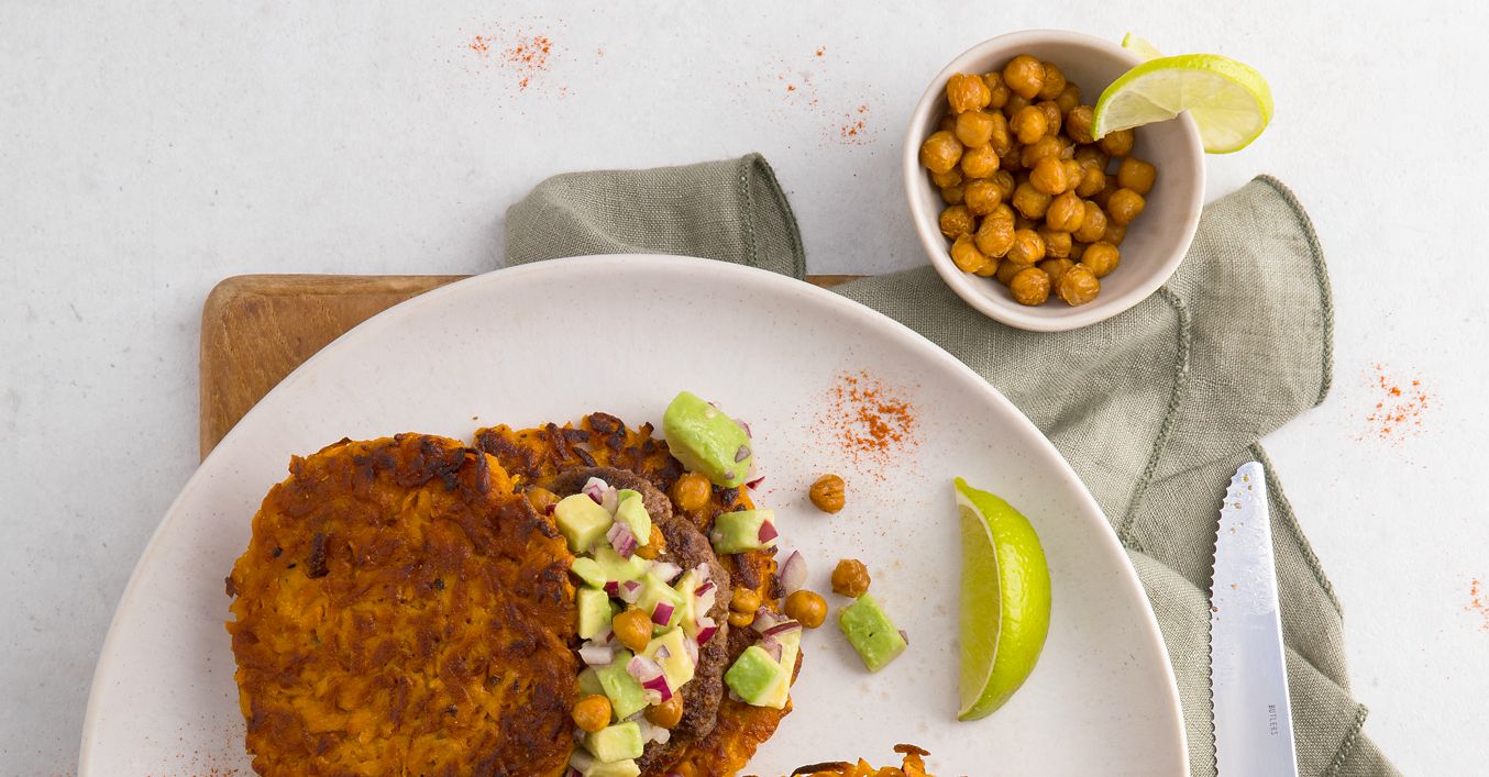 Für den Burger je ein Rösti als Boden auf den Teller legen, Burgerpatty darauflegen, Avocado-Crunch-Salat darüber verteilen und mit dem zweiten Rösti abschließen.