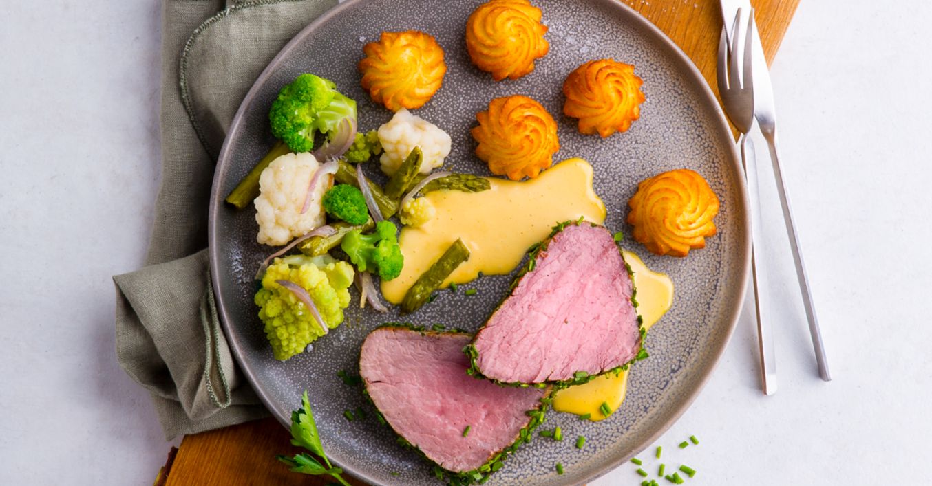 Rinderfilet mit übrigem Senf einreiben, pfeffern, in den gehackten Kräutern wälzen, in 12 Tranchen schneiden und mit Gemüse, Hollandaise und Herzoginkartoffeln servieren.