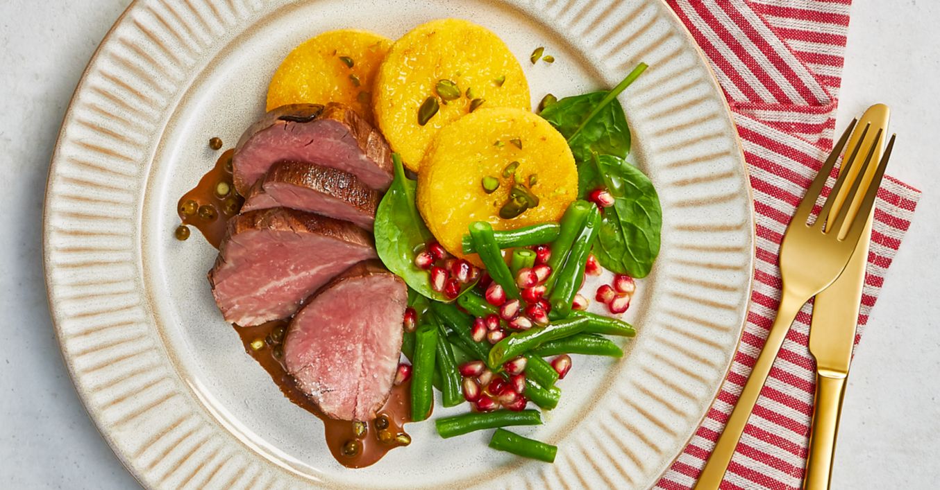 Spinat waschen und mit den Bohnen, Salz, Pfeffer, restlichem Öl und Essig vermischen. Filet auspacken, salzen, in Scheiben schneiden und mit Whiskysauce, Polenta und Salat anrichten.