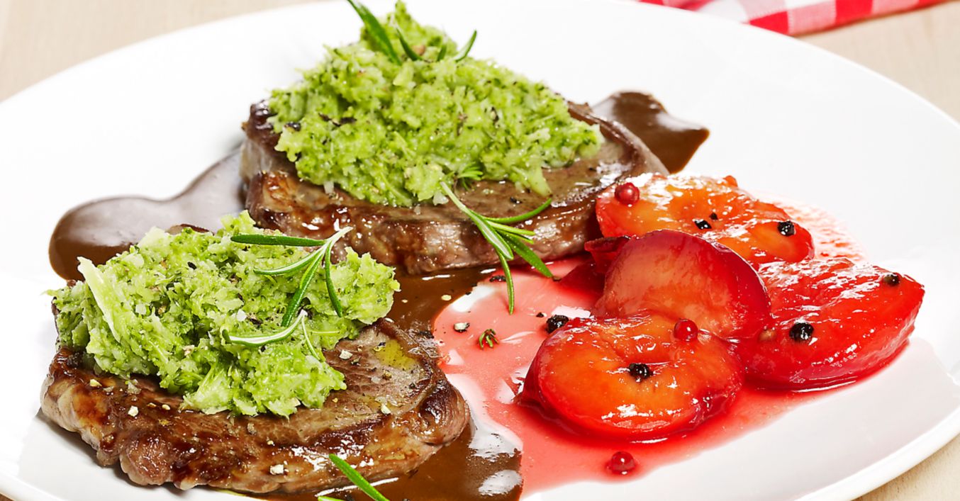 Rindersteaks mit Broccolipüree und Pfefferpflaumen