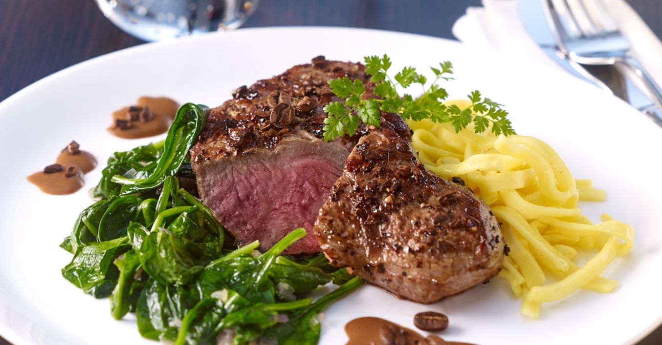 Steaks, Spinat, Nudeln und Kaffeesoße auf Tellern anrichten und servieren.