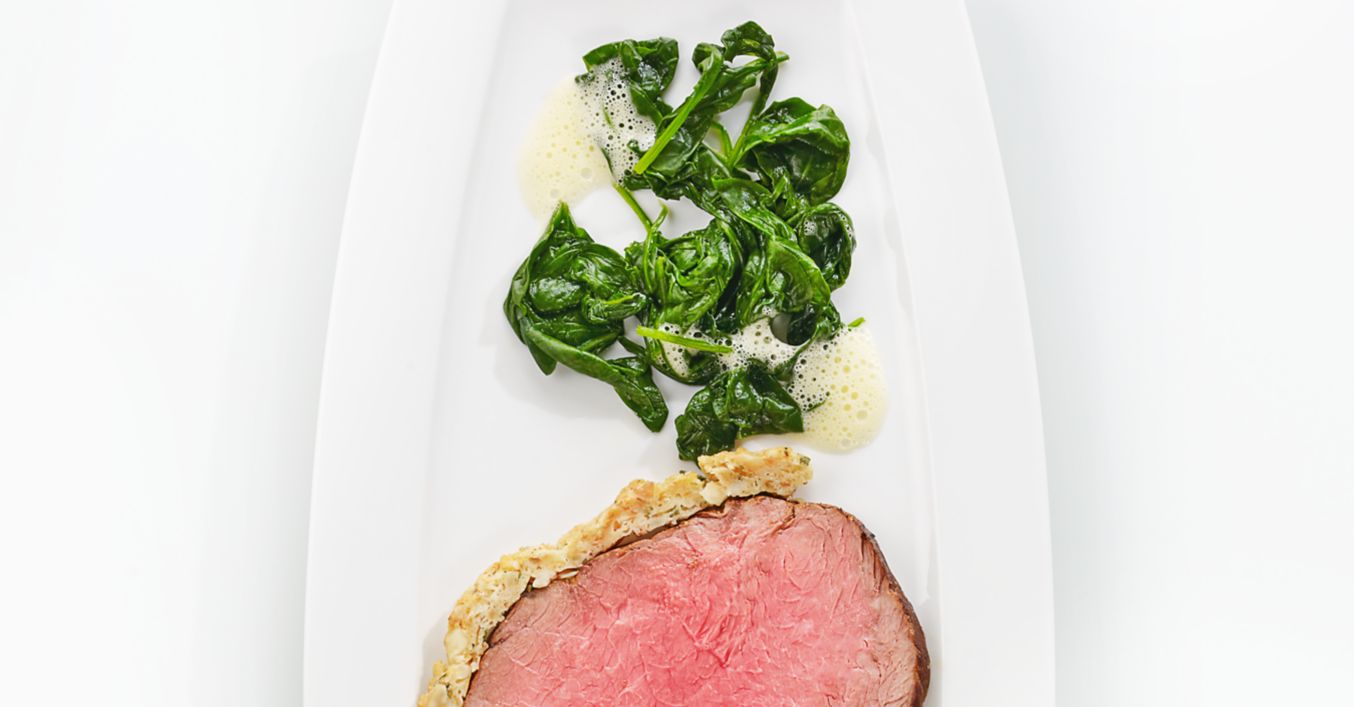 Das Roastbeef mit Haube in Scheiben geschnitten dekorativ mit den Kartoffeln und dem Spinat anrichten.
