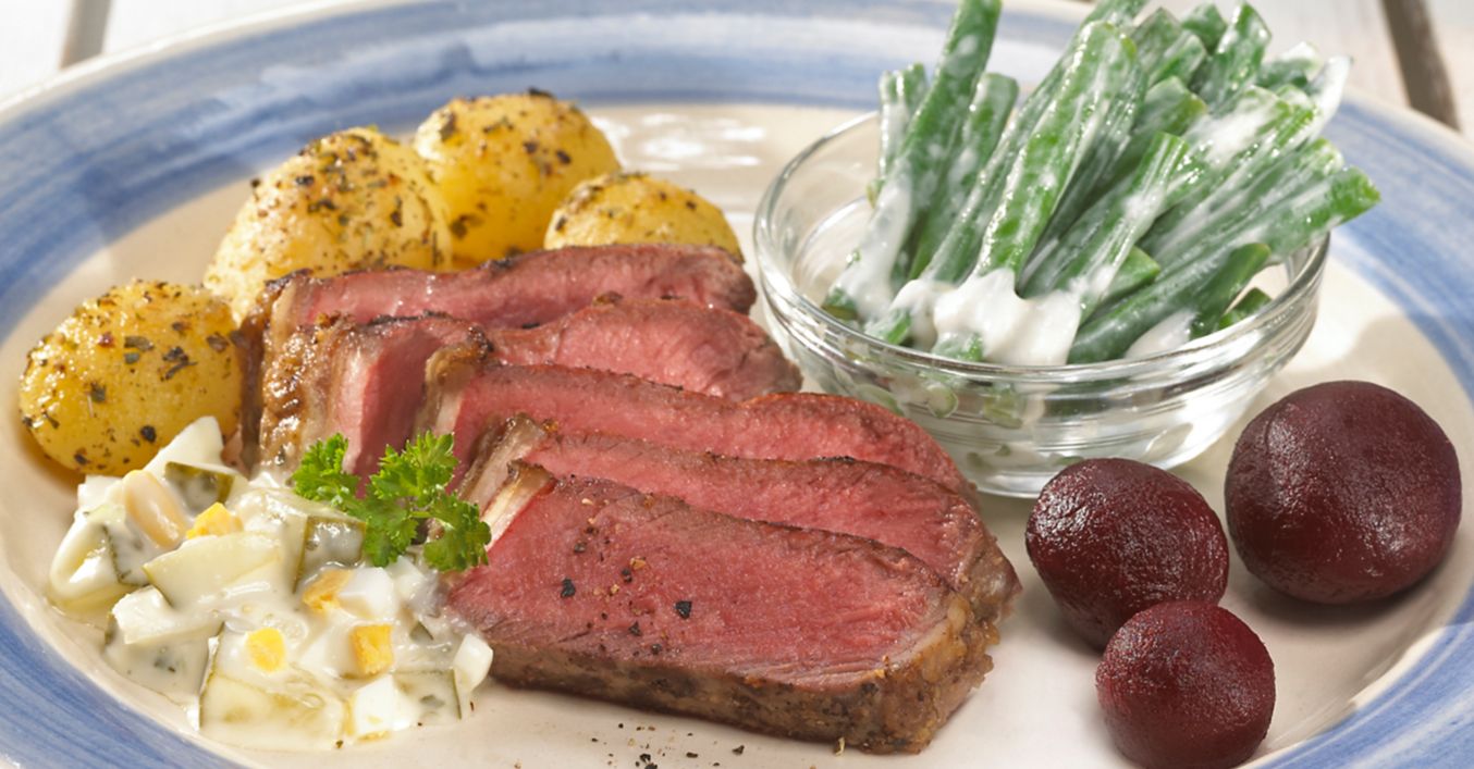 Roastbeef aufschneiden, mit Remoulade, Rote-Bete-Kugeln, Röstkartoffeln und Bohnensalat servieren.