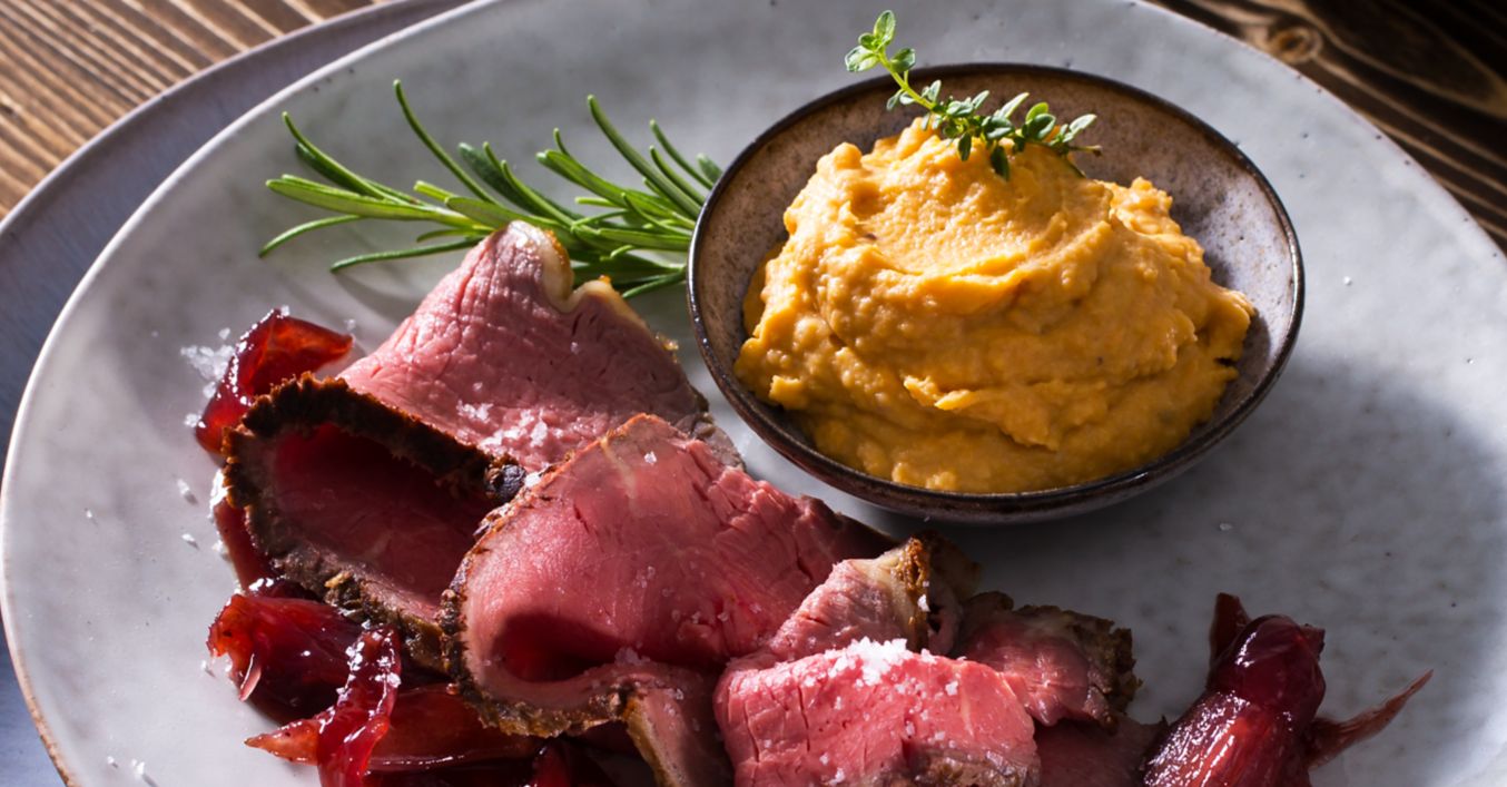 Das Fleisch dann aus dem Ofen nehmen und in Alufolie wickeln. 5 Minuten ruhen lassen. In der Zwischenzeit die Portweinschalotten und den Maronen-Kartoffelstampf nochmals erwärmen. Das Fleisch dann mit Salz und Pfeffer würzen und in Scheiben schneiden. Das Fleisch mit den Portweinschalotten auf Tellern anrichten und mit dem Maronen-Kartoffelstampf servieren.