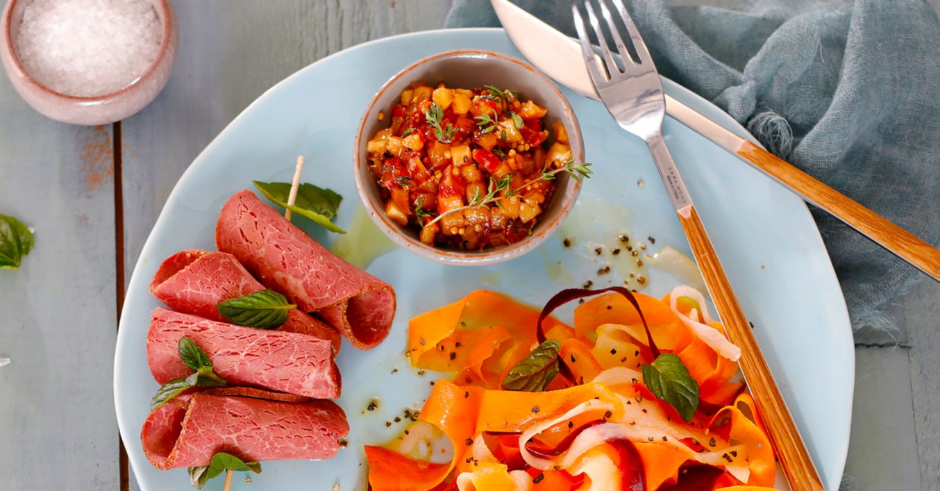 Roastbeefröllchen auf Möhrensalat mit Apfelchutney