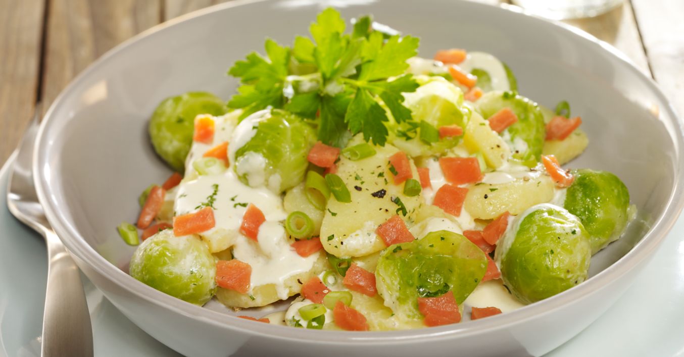 Kartoffeln gründlich waschen, als Pellkartoffeln garen, noch heiß pellen und in Scheiben schneiden. Rosenkohl putzen, waschen, den Strunk einschneiden, den Rosenkohl circa 10 bis 15 Minuten in Brühe garen und abtropfen lassen. Rosenkohl abtropfen lassen, dabei 100 Milliliter Brühe auffangen.