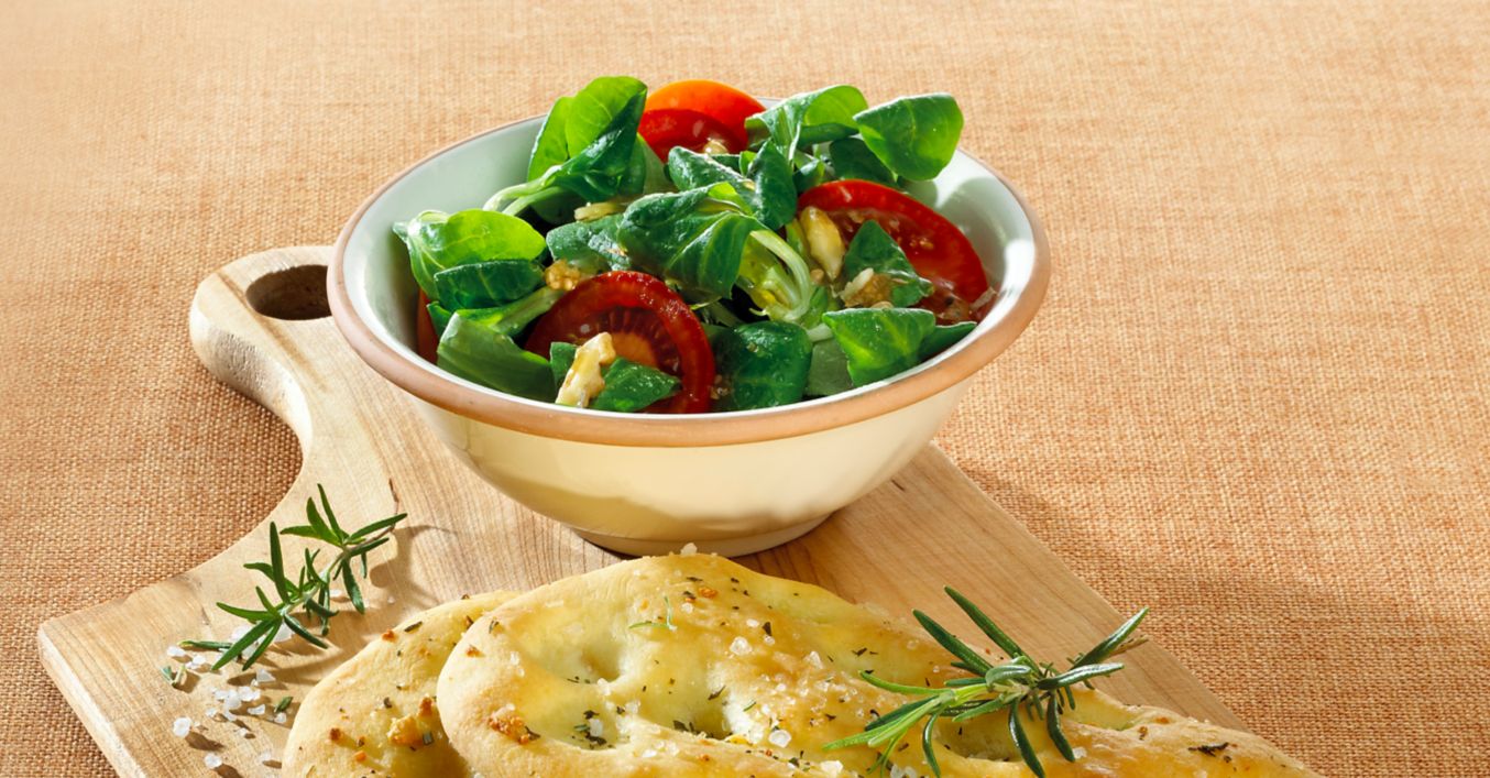 Für den Salat: Feldsalat waschen und gut abtupfen. Tomaten in Scheiben schneiden. Für das Dressing Olivenöl, Essig und Gelee verquirlen und mit Walnüssen, Salat und Tomatenscheiben vermischen. Mit Salz und Pfeffer würzen. Zur Rosmarin-Focaccia servieren.