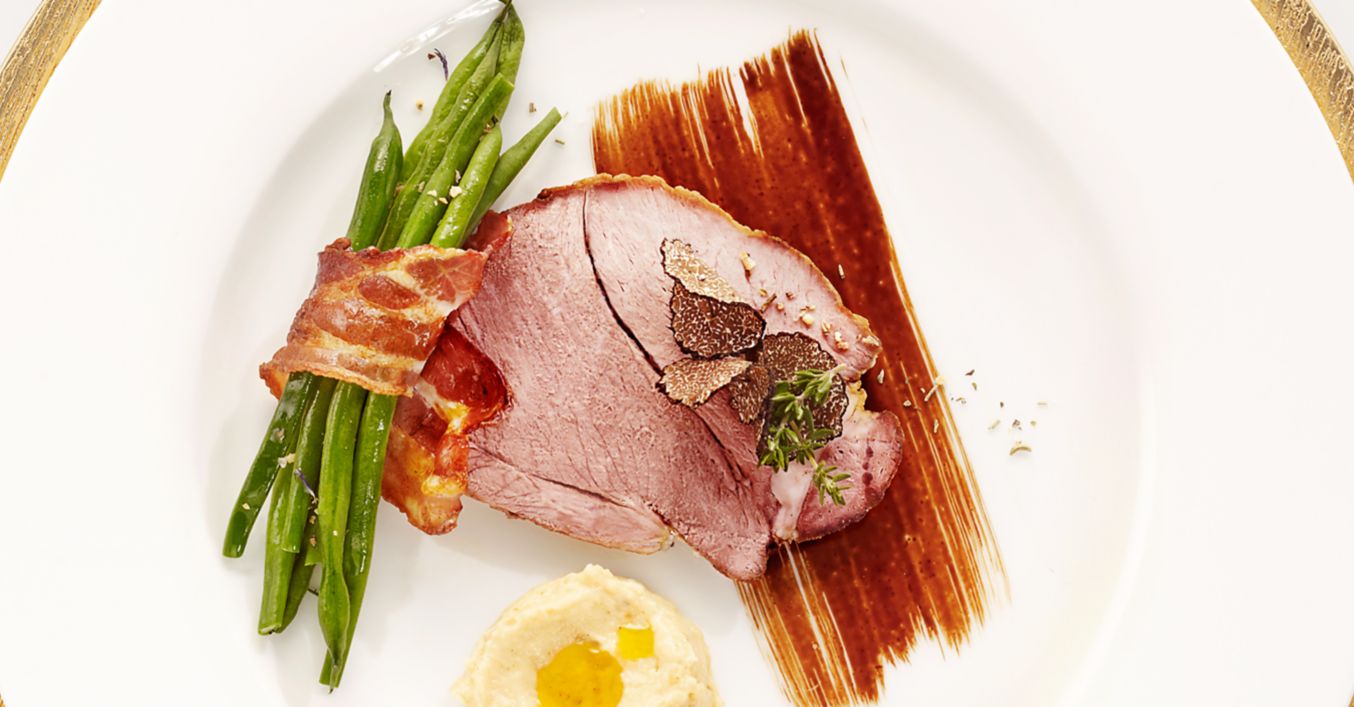 Rosmarin-Lammkeule mit Bohnen im Speckmantel