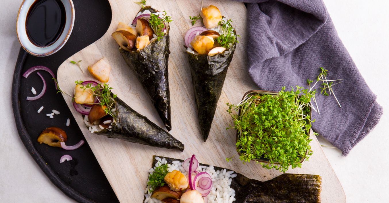 Zwiebel abziehen und in feine Ringe schneiden. Nori-Blätter mit Reis, Rotbarsch und Champignons belegen und zu Tütchen formen. Kresse vom Beet schneiden und Temaki mit Zwiebeln und Kresse garniert servieren.